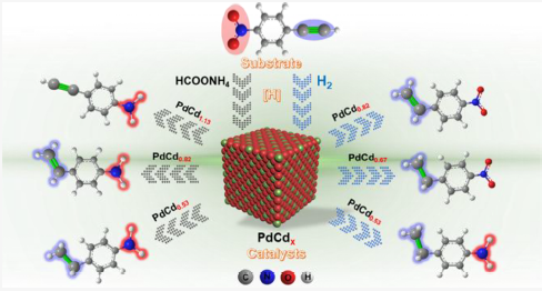 The pursuit of efficient hydrogenation nanocatalysts with a desirable selectivity toward intricate substrates is state-of-the-art research but remains a formidable challenge. Herein, we report a series of novel PdCdx nanocubes (NCs) for ultraselective hydrogenation reactions with flexible tuning features. Obtaining a desirable conversion level of the substrates (e.g., 4-nitrophenylacetylene (NPA), 4-nitrobenzaldehyde (NBAD), and 4-nitrostyrene (NS)) and competitive selectivity for all potential hydrogenation products have been achieved one by one under optimized hydrogenation conditions. The performance of these PdCdx NCs displays an evident dependence on both the composition and the use of Cd and a need for a distinct hydrogen source (H2 or HCOONH4). Additionally, for the selectivity of hydrogen to be suitably high, the morphology of the NCs has a very well-defined effect. Density functional theory calculations confirmed the variation of adsorption energy for the substrate and hydrogenation products by carefully controlled introduction of Cd, leading to a desirable level of selectivity for all potential hydrogenation products. The PdCdx NCs also exhibit excellent reusability with negligible activity/selectivity decay and structural/composition changes after consecutive reactions. The present study provides an advanced strategy for the rational design of superior hydrogenation nanocatalysts to achieve a practical application for desirable and selective hydrogenation reaction efficiency.