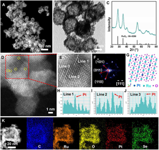 Realizing stable and efficient overall water splitting is highly desirable for sustainable and efficient hydrogen production yet challenging because of the rapid deactivation of electrocatalysts during the acidic oxygen evolution process. Here, we report that the single-site Pt-doped RuO2 hollow nanospheres (SS Pt-RuO2 HNSs) with interstitial C can serve as highly active and stable electrocatalysts for overall water splitting in 0.5 M H2SO4. The performance toward overall water splitting have surpassed most of the reported catalysts. Impressively, the SS Pt-RuO2 HNSs exhibit promising stability in polymer electrolyte membrane electrolyzer at 100 mA cm−2 during continuous operation for 100 hours. Detailed experiments reveal that the interstitial C can elongate Ru-O and Pt-O bonds, and the presence of SS Pt can readily vary the electronic properties of RuO2 and improve the OER activity by reducing the energy barriers and enhancing the dissociation energy of *O species.