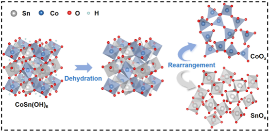 Amorphous materials have attracted increasing attention in diverse fields due to their unique properties, yet their controllable fabrications still remain great challenges. Here, we demonstrate a top-down strategy for the fabrications of amorphous oxides through the amorphization of hydroxides. The versatility of this strategy has been validated by the amorphizations of unitary, binary and ternary hydroxides. Detailed characterizations indicate that the amorphization process is realized by the variation of coordination environment during thermal treatment, where the M–OH octahedral structure in hydroxides evolves to M–O tetrahedral structure in amorphous oxides with the disappearance of the M–M coordination. The optimal amorphous oxide (FeCoSn(OH)6-300) exhibits superior oxygen evolution reaction (OER) activity in alkaline media, where the turnover frequency (TOF) value is 39.4 times higher than that of FeCoSn(OH)6. Moreover, the enhanced OER performance and the amorphization process are investigated with density functional theory (DFT) and molecule dynamics (MD) simulations. The reported top-down fabrication strategy for fabricating amorphous oxides, may further promote fundamental research into and practical applications of amorphous materials for catalysis.